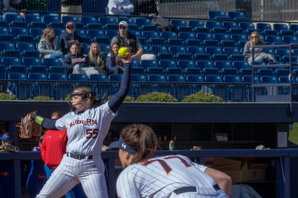 Feb. 13, 2022; Auburn, Ala; Shelby Lowe (55) pitches the ball during a game against UMass Lowell in the Tiger Invitational from Jane B. Moore Field.