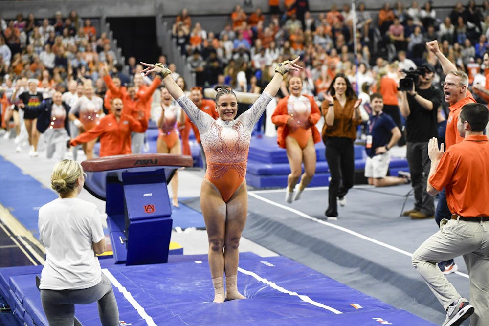 Auburn Gymnast Julianne Huff salutes after sticking a landing on vault during a meet with Alabama in Neville Arena on Friday, Feb. 20, 2026.
