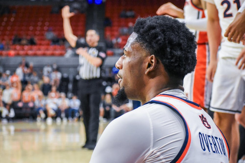 Kevin Overton (1) falls after attempting a three-pointer against Nevada in Neville Arena in Auburn, AL on March 25, 2026.