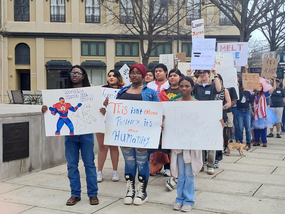 February 21Seania Player (left), Ronny Martin (middle) and Lillian Speigner (right) speak at the "Say No 2 ICE" march on Feb. 21, 2026.