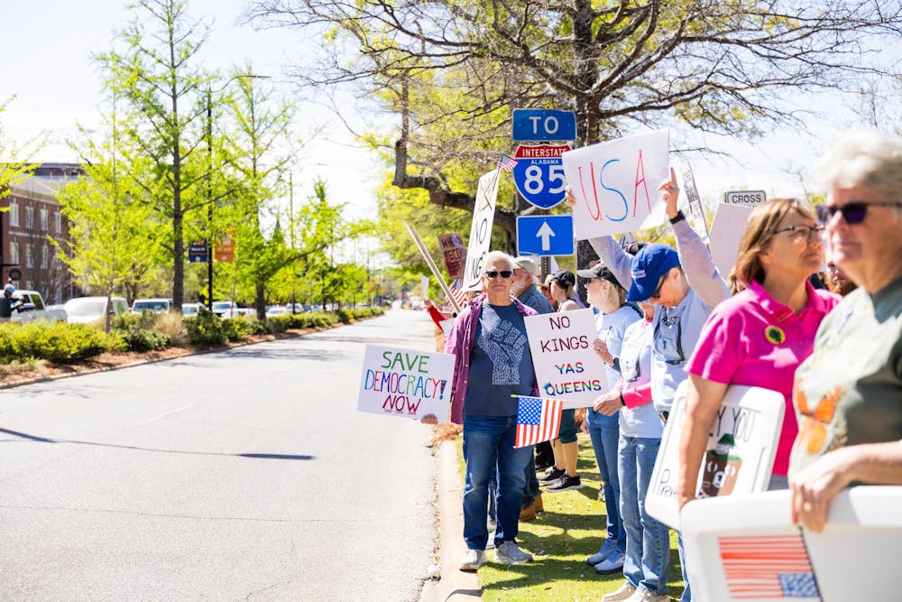 Protesters line up along College Street on March 28, 2026.