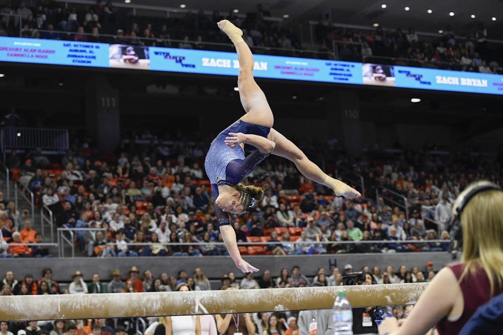 Auburn Gymnast Alex Irvine performs a one-handed back walkover on beam in a matchup against Kentucky in Neville Arena on Friday, Feb. 6, 2026.