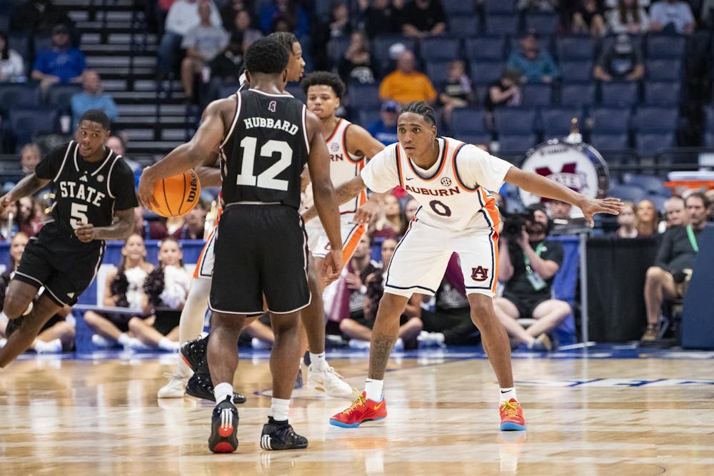 By Elizabeth Marsh | Photographer | March 11Auburn Forward Filip Jović (38) moves to block a three-point attempt during a matchup against Mississippi State in Bridgestone Arena on Wednesday, Mar. 11, 2026.
