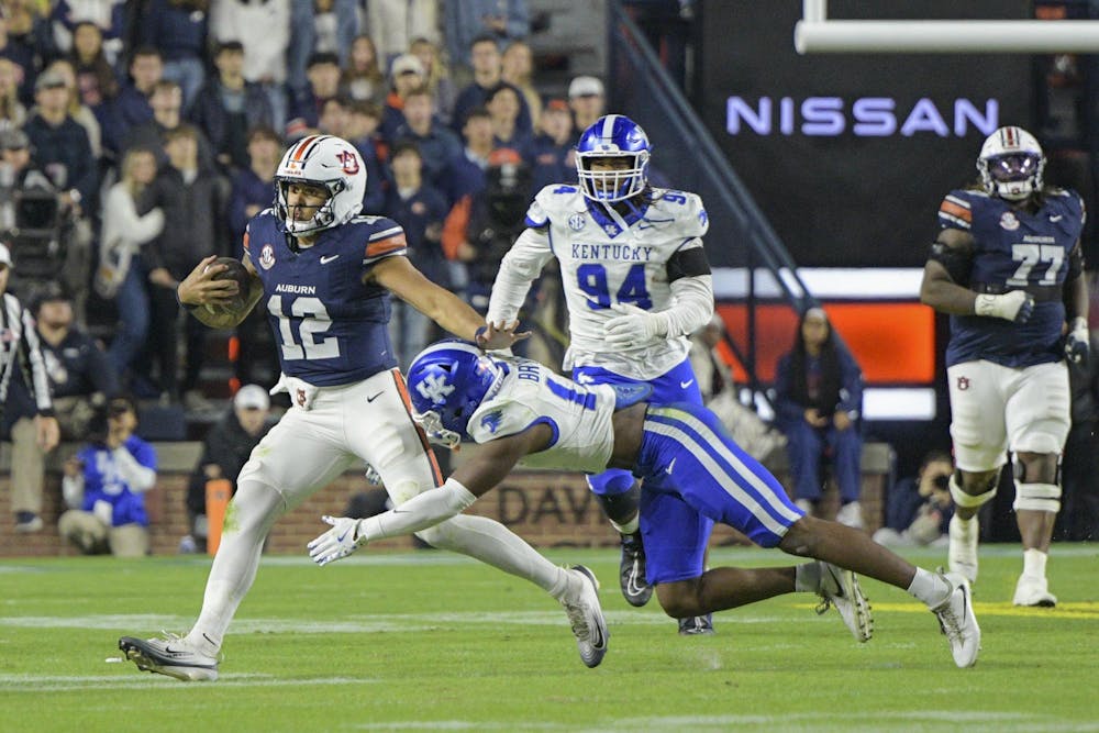 Auburn Quarterback Ashton Daniels (12) is tackled for a loss by Kentucky Defensive Back Ty Bryant (14) during a matchup between the two teams in Jordan-Hare Stadium on Nov. 1, 2025.
