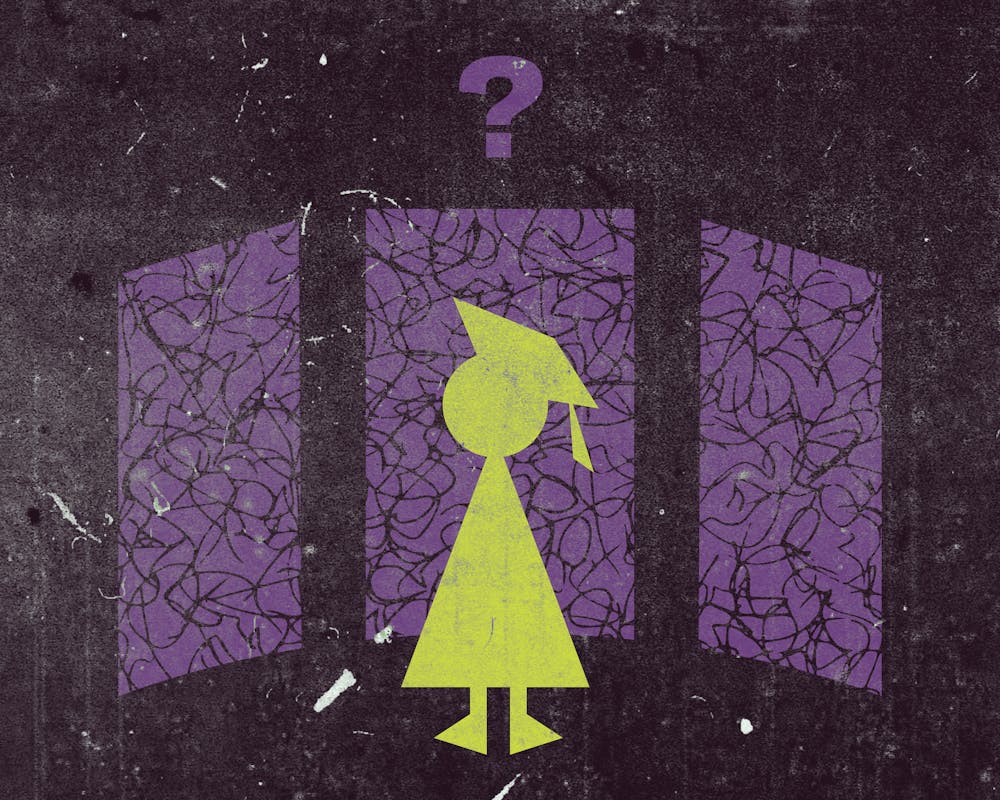 A yellow figure wearing a graduation cap stands between two purple panels, with a question mark above.
