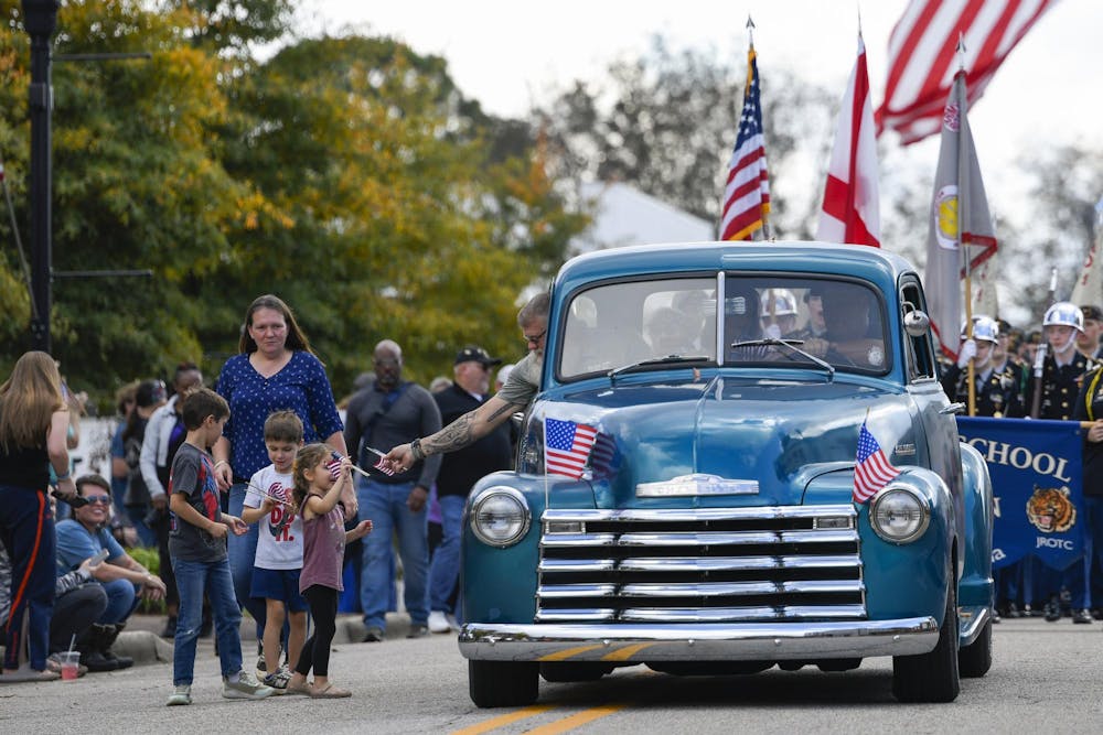 Parade participants hand out flags to children during the Freedom Fest Veterans Parade in Opelika, AL on Saturday, Nov. 8, 2025.