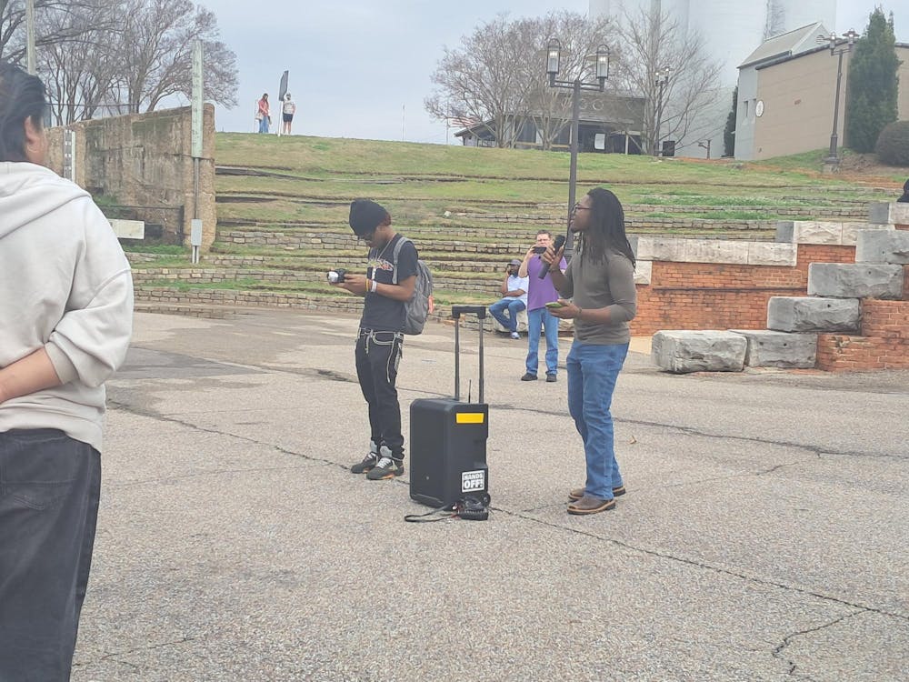February 21Seania Player (left), Ronny Martin (middle) and Lillian Speigner (right) speak at the "Say No 2 ICE" march on Feb. 21, 2026.