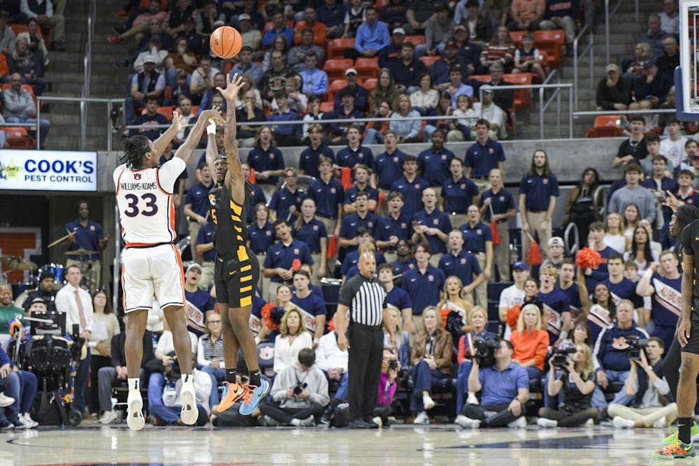 Auburn Forward Sebastian Williams-Adams (33) shoots for three during a matchup against Bethune-Cookman University in Neville Arena on Monday, Nov. 3, 2025.