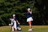 A female golfer in a blue top and white skirt prepares to swing a club, while a second golfer stands nearby with a golf bag. Contributed by Auburn Athletics