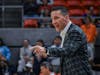 Auburn Coach, Steven Pearl, gets upset with refs against Nevada in Neville Arena in Auburn, AL on March 25, 2026.